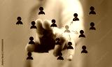 Hand reaching towards a central person, symbolizing targeted marketing, audience engagement, and connection.