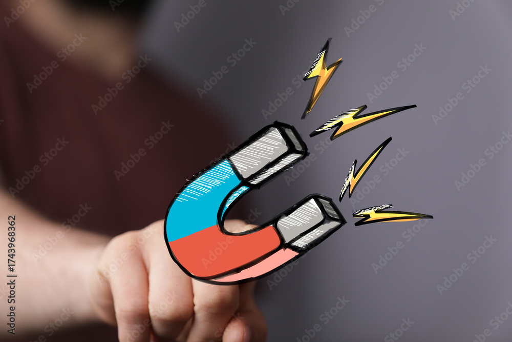 Image of a hand and magnet. Ideal for marketing, business, and attraction concepts. High-quality stock photo.