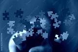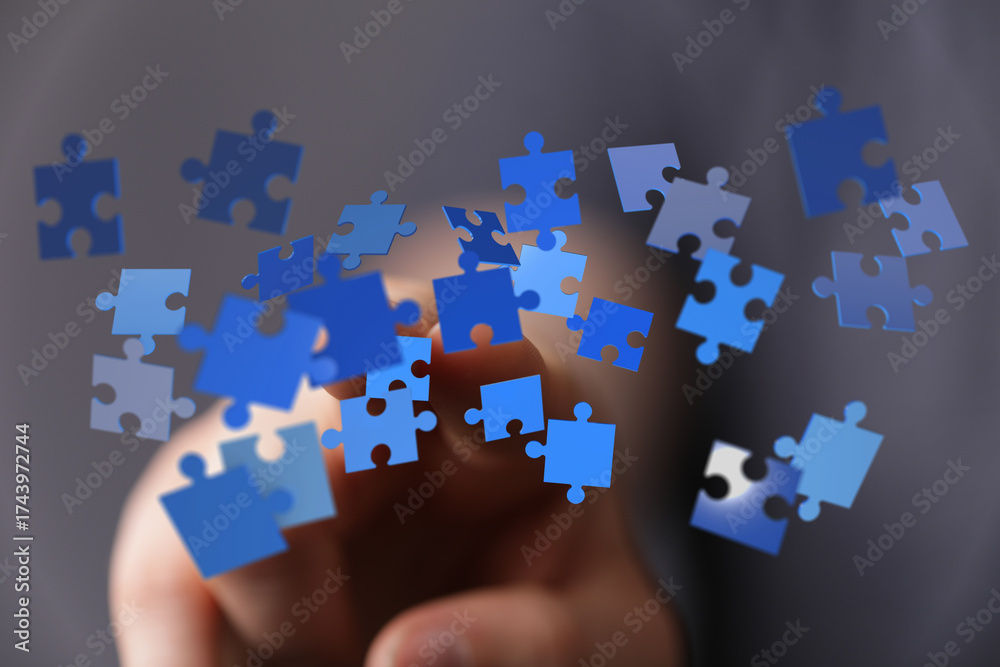 Floating puzzle pieces represent solutions, connection and teamwork. This image shows a person's hand interacting with jigsaw puzzle pieces to s
