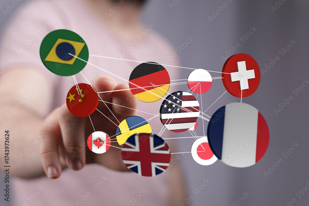 A hand interacting with a network of global flags, symbolizing interconnectedness, international relations, and global communication.
