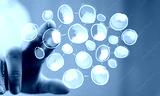 Abstract image of hand interacting with a network of interconnected circles. Ideal for business, technology, and teamwork concepts.