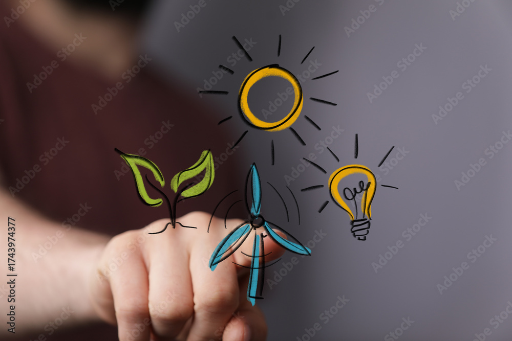 Hand pointing at eco-friendly icons: sun, plant, wind turbine, lightbulb. Clean energy, sustainability, innovation.