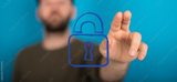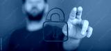 Close-up of a hand reaching for a digital lock icon. Cybersecurity, protection, privacy concept.