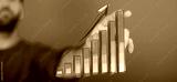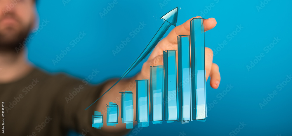 Stock photo of a hand drawing a rising bar graph, symbolizing growth, success, and progress.