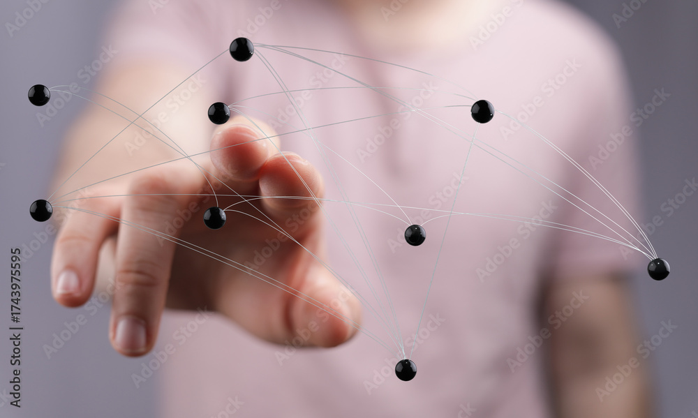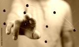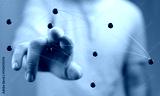 Abstract image of a hand interacting with a digital network, representing connection, technology, and global communication.