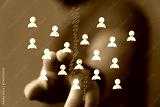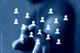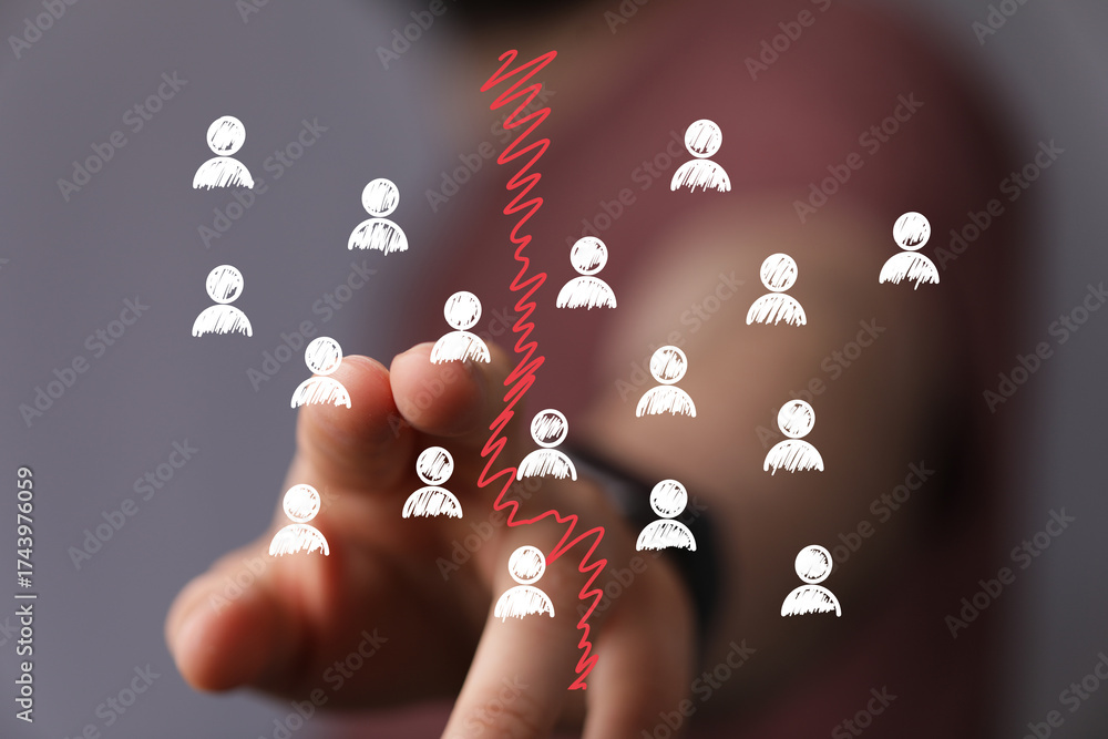 Hand divides group icons, symbolizing conflict, separation, or business split. Ideal for articles about teamwork challenges.