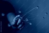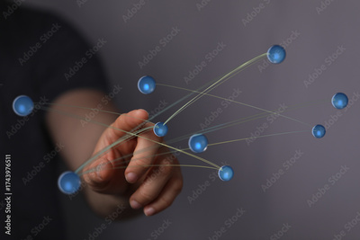 Abstract image of a hand connecting digital network nodes. Ideal for technology, connection, and networking concepts.