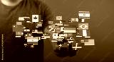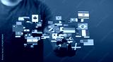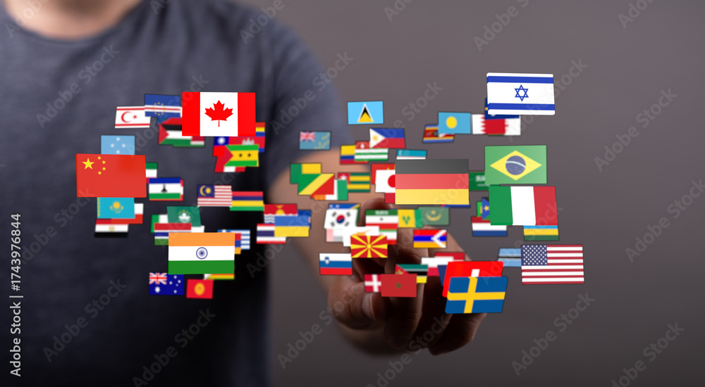 Concept of global communication and cultural exchange represented by a hand holding many flags. Demonstrates international relations and teamwor
