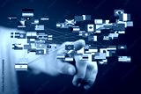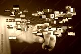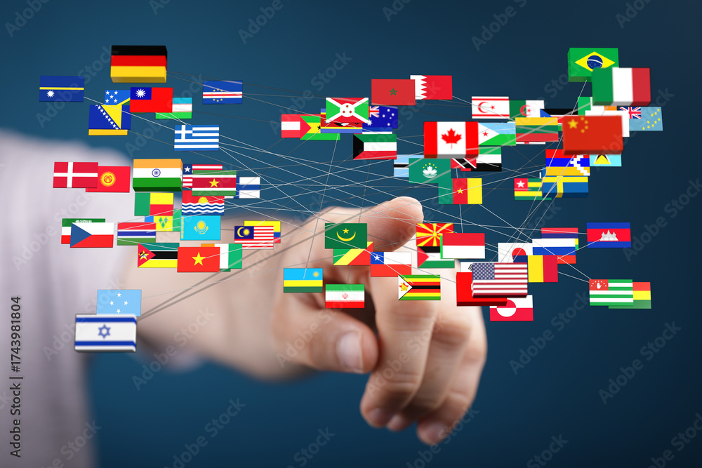 A digital illustration of a hand interacting with a network of floating flags representing various countries, symbolizing global unity and inter