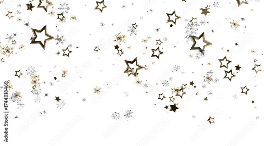 Sparkling gold stars and snowflakes on white. Perfect for holiday designs, cards, and celebrations.