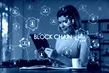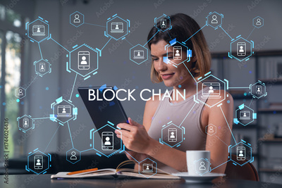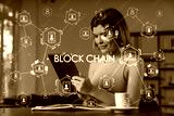 Woman using tablet with blockchain network icons and digital connections overlaid on office background, representing modern data security concept.