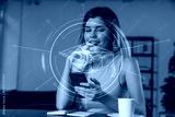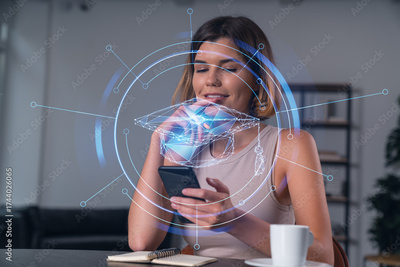Woman using smartphone with holographic graduation cap interface in modern room, showcasing smart education and futuristic learning concept.