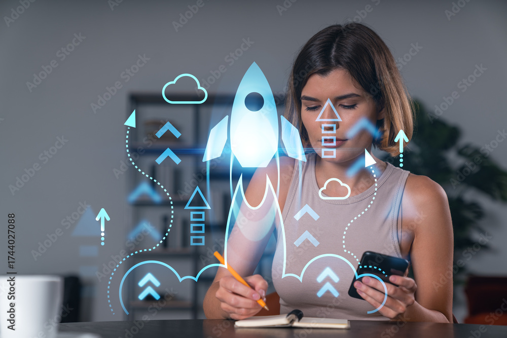 Woman planning startup project with rocket launch graphics and upward arrows on transparent futuristic interface in office environment concept..