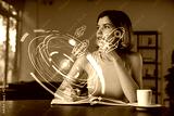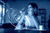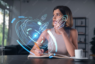 Woman writing in notebook with futuristic rocket launch HUD graphics illustrating innovation and startup success concept in modern workspace..