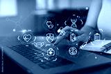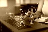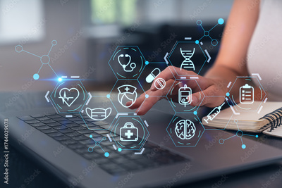 Digital healthcare concept with medical icons and technology interface overlay on laptop and person hand on keyboard in modern workspace..