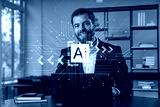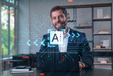 Smiling businessman working on laptop with AI interface overlay in modern office environment, representing artificial intelligence concept.