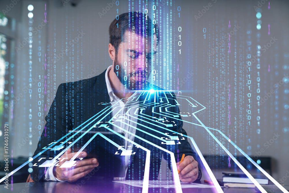 Businessman using tablet and writing with stylized digital circuit and binary code overlay representing futuristic data technology concept.
