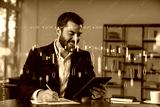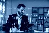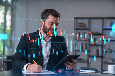 Businessman analyzing financial data on tablet with stock market chart overlay in modern office, smiling and taking notes. Concept of trading success.