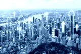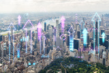 Futuristic digital growth concept over Manhattan skyline with colorful upward arrows and graphs representing business and financial development in NYC.