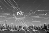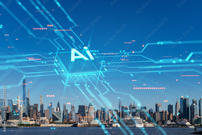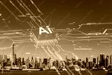 AI technology concept over Manhattan skyline in New York City with digital circuit overlay on clear blue sky background, symbolizing innovation and future.