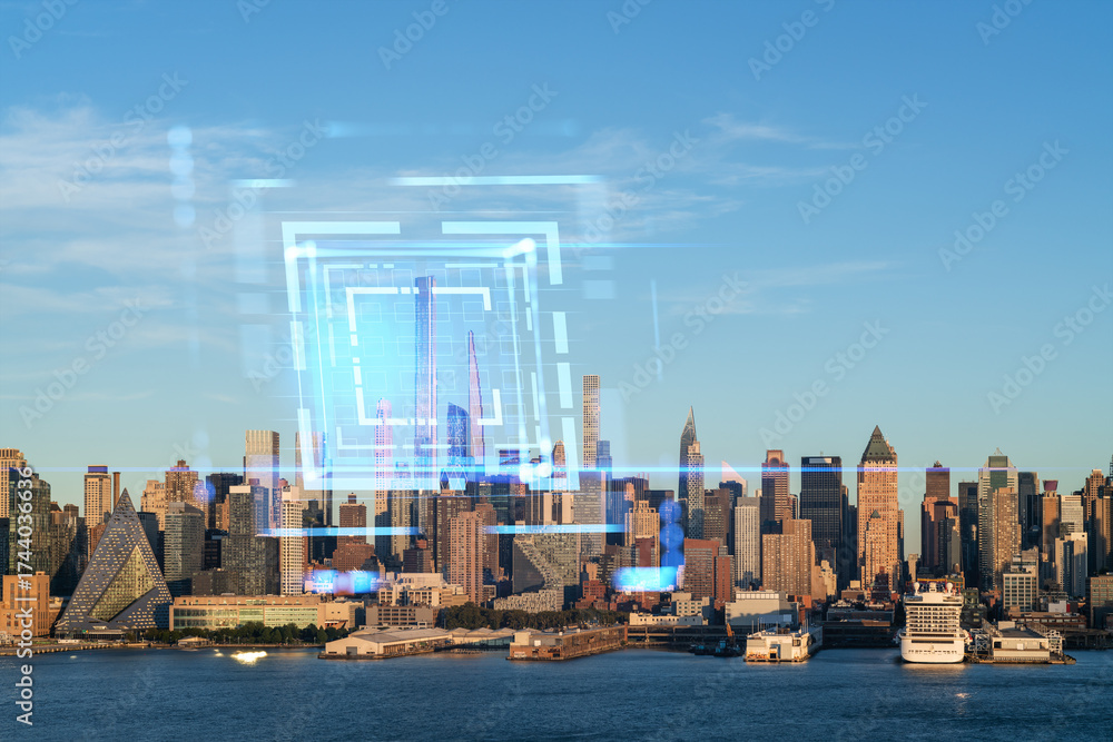 Manhattan skyline with futuristic digital interface elements overlaid on clear blue sky at sunset, symbolizing NYC smart city concept and innovation.
