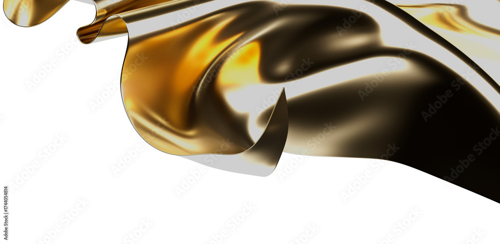 Abstract image of flowing, shiny gold metallic cloth against a clean white background. Perfect for concepts of luxury, elegance, and design elem