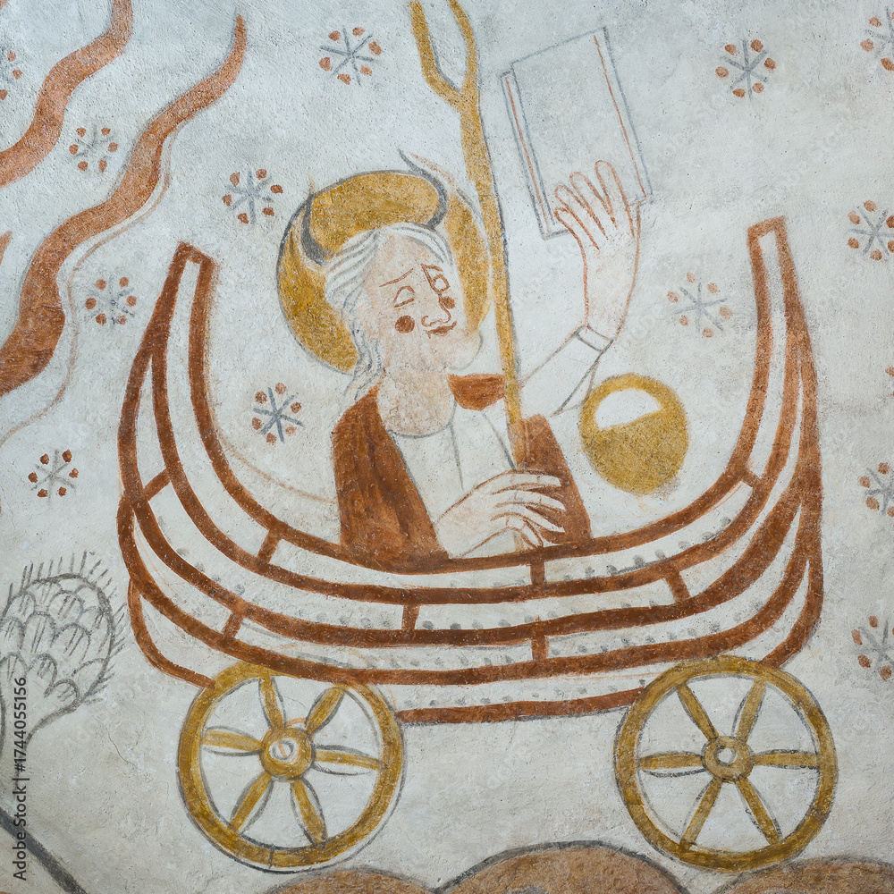 Moses sitting in an ark with two weels holding the Stone Tablets