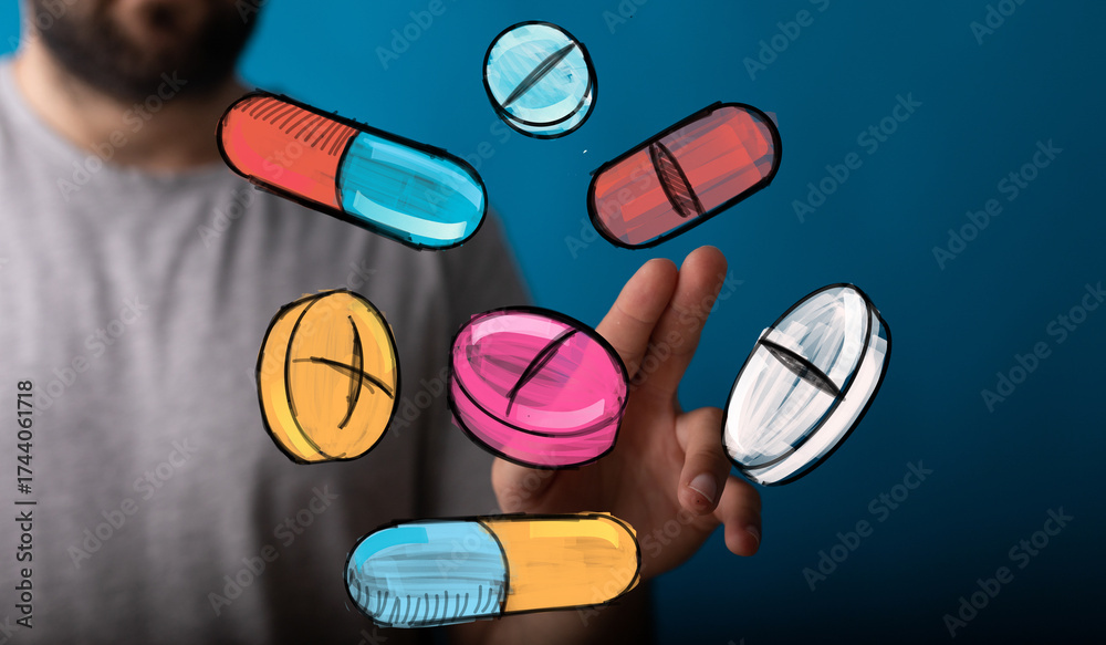 Image of hand interacting with colorful pills and capsules. Perfect for healthcare, medicine, or pharmacy concepts.