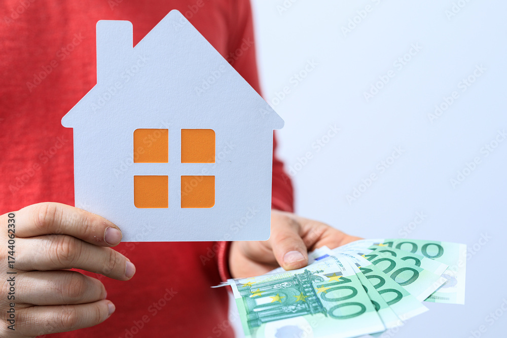 Concept of real estate, house and finance: Hand holding house cutout next to Euro banknotes. Investment concept, mortgage, property market and f