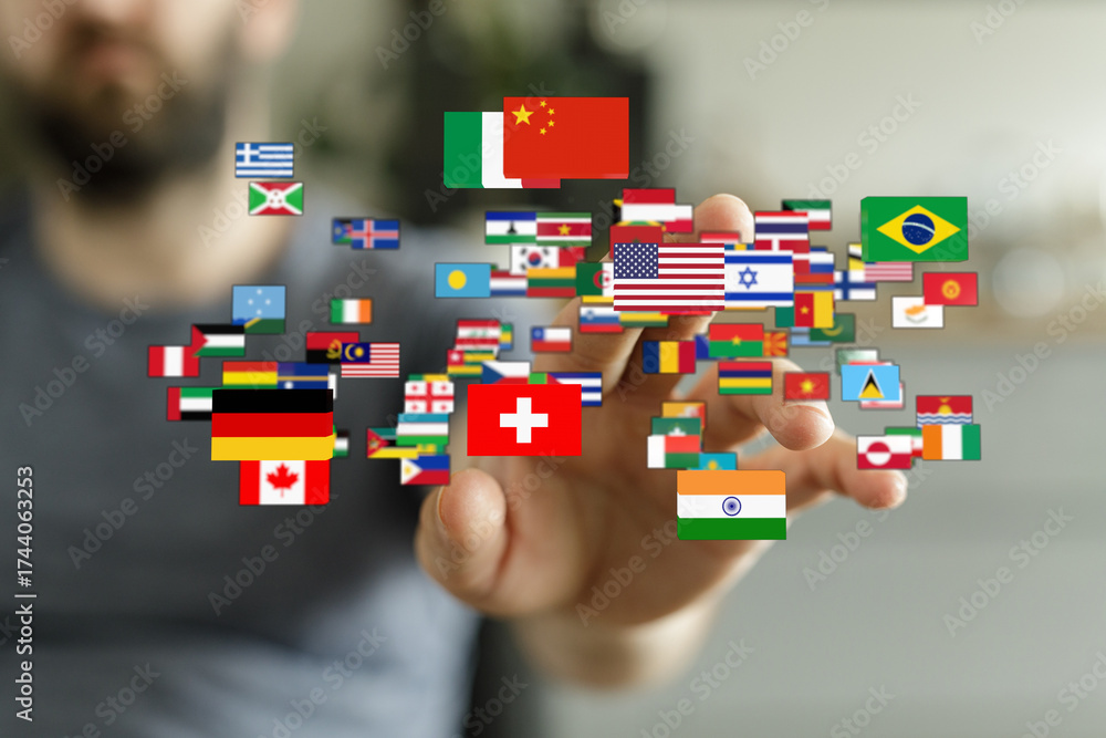 A hand reaching out towards a collection of flags from different countries, symbolizing global unity, international relations, and the concept o