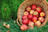 Fresh ripe apples in wicker basket and fallen leaves on green grass outdoors, closeup