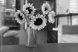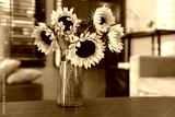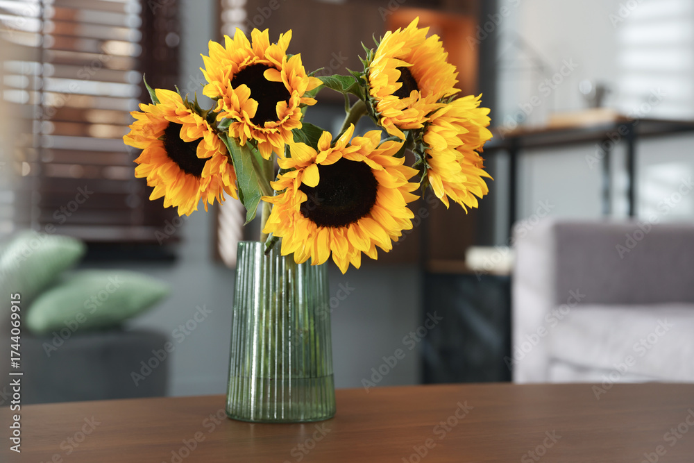 Beautiful sunflowers in vase on wooden table indoors