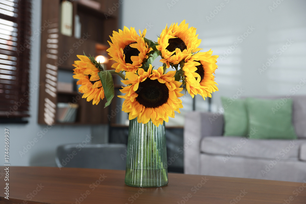 Beautiful sunflowers in vase on wooden table indoors
