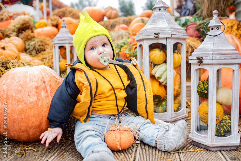 A baby boy in a jacket, hat, and jeans sits among pumpkins outside