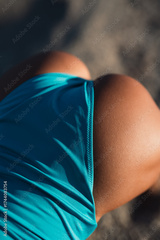 Close-up detail of a woman’s hip and swimsuit in turquoise fabric on the beach, illuminated by soft natural sunlight, showing skin texture, fabric folds, and morning warmth