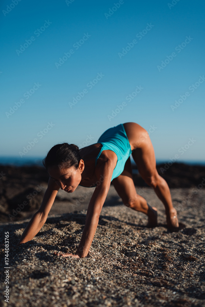 Focused athletic woman in turquoise swimsuit doing plank exercise on sandy beach during sunrise, demonstrating strength, balance, and body control with natural ocean background and warm light