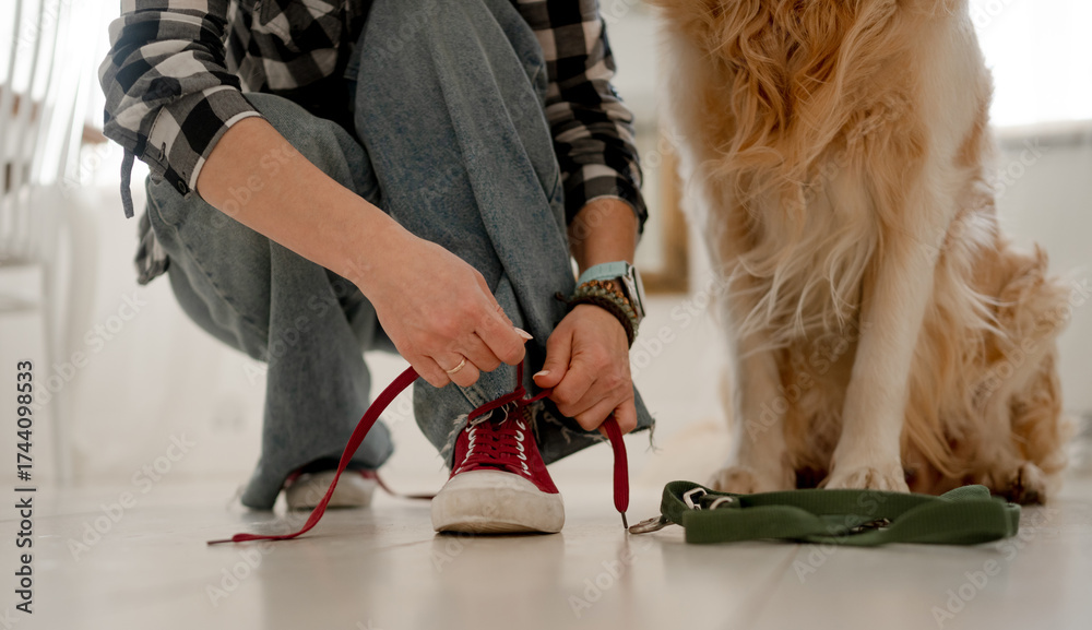 Girl Tying Shoelaces On Sneakers Before Walking With Dog