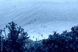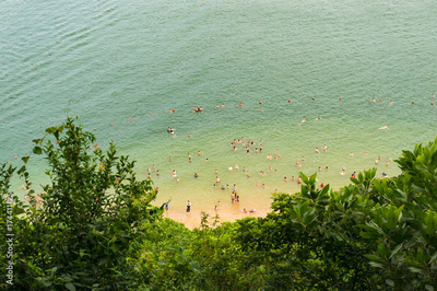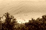 Aerial view of unidentifiable people swimming on the beach