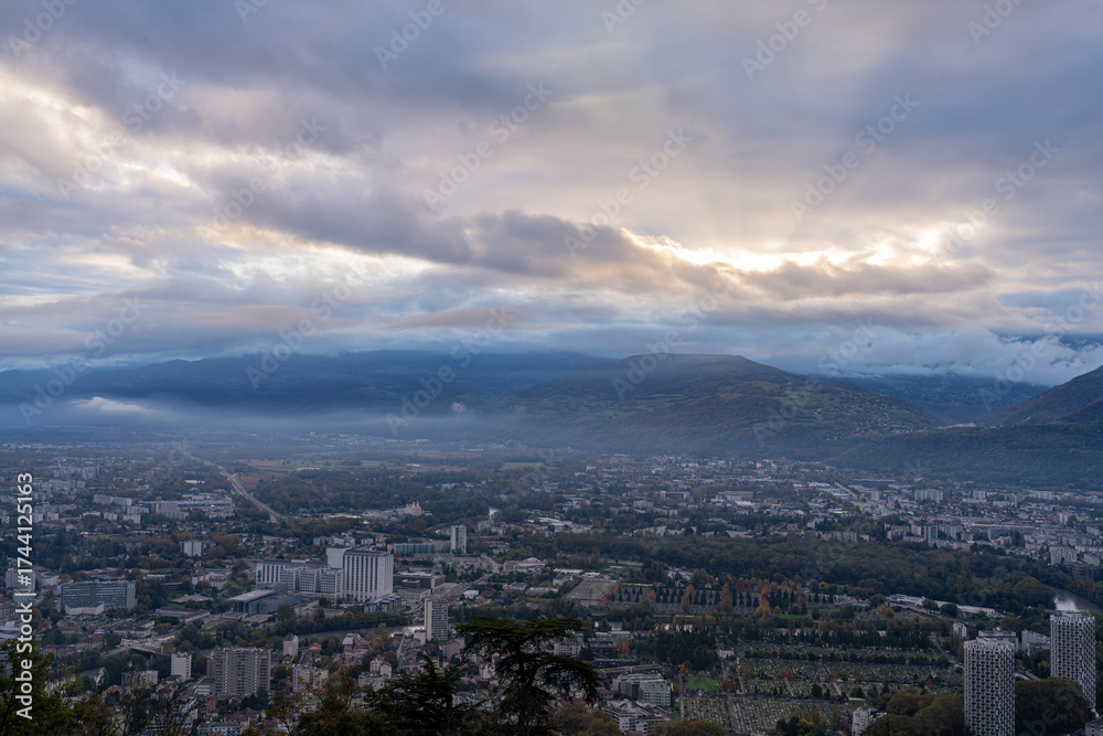 Panoramic view of Grenoble from the surrounding mountains, showcasing the city nestled in the valley with the Alps rising majestically in the background under clear natural light.