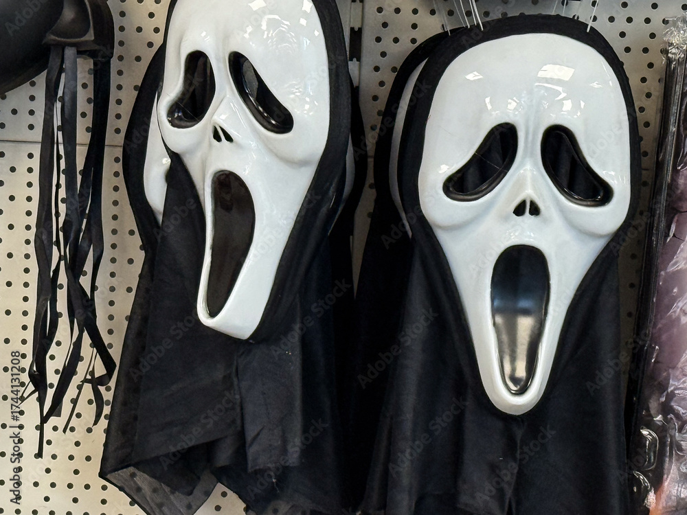 White plastic masks with wide open mouths and black drapes hanging on retail shelf. Horror disguise, halloween costume, spooky entertainment, cultural tradition and eerie movie character.