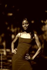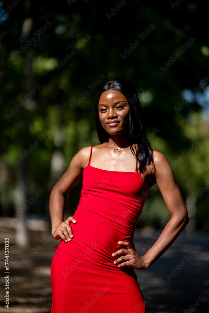Happy elegant woman wearing red dress posing outdoors confidently during stylish summer afternoon