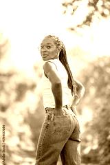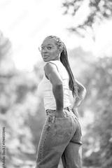 Attractive woman posing outdoors smiling with braided hairstyle wearing trendy glasses and jeans