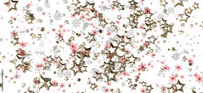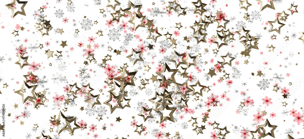 Elegant design with golden stars, red details and snowflakes against a clean white backdrop suitable for festive greetings and celebrations. Ide