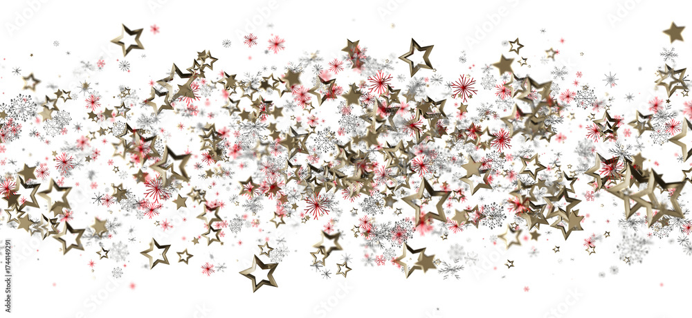 Festive abstract design with gold stars and snowflakes floating on white background, ideal for Christmas or holiday themes.