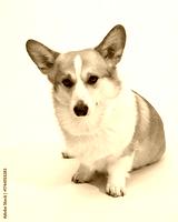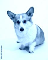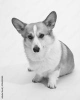 Full-body front-facing corgi sitting on white background in studio setting
