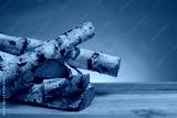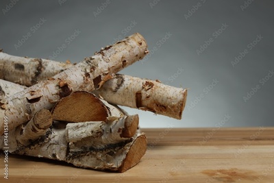 Pile of cut firewood on wooden table against grey background, closeup. Space for text