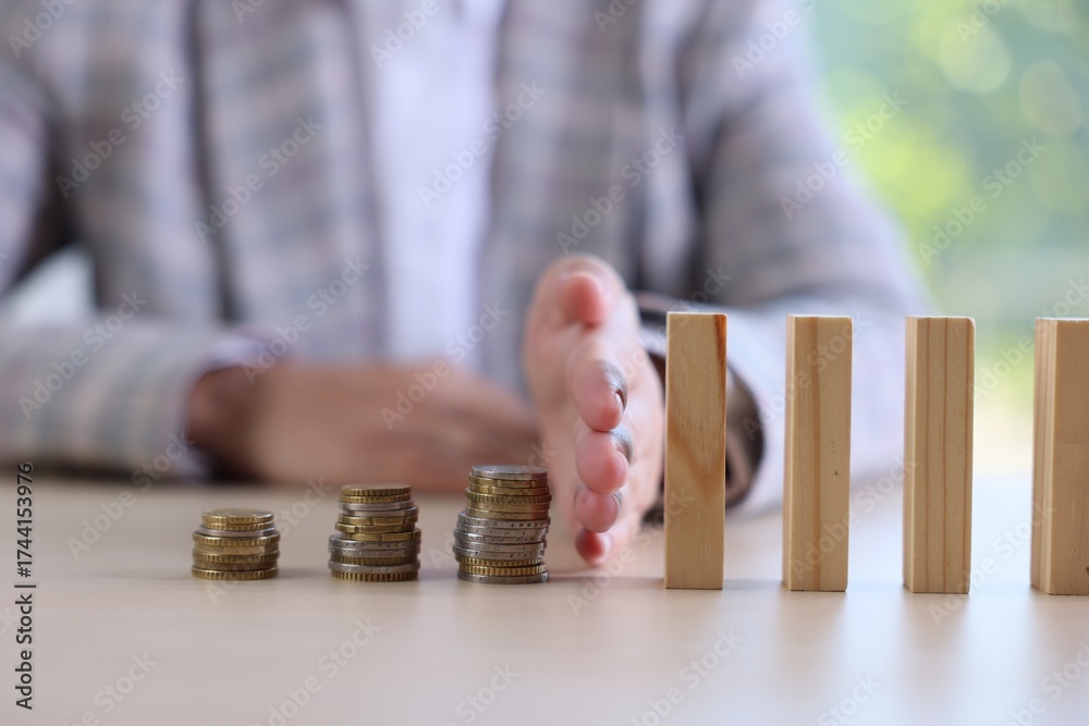 Risk. Woman stopping domino effect to protect coins at table, closeup