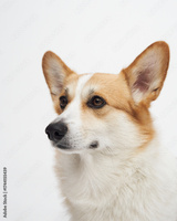 Straight frontal sitting pose of a Welsh corgi on plain white backdrop
