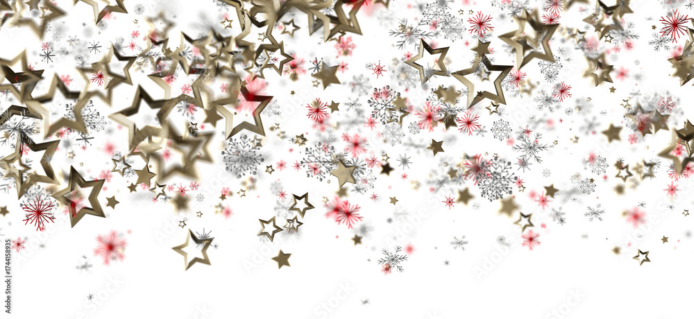 Christmas holiday background of falling stars and snowflakes in red and gold. Perfect for greeting cards or seasonal designs, white background.