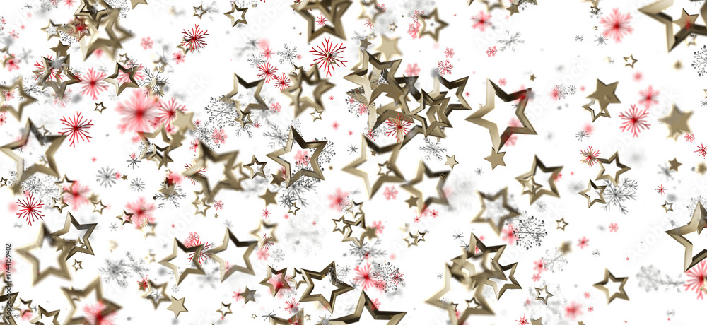 Abstract festive background featuring gold stars and red snowflakes. Perfect for holiday designs and celebrations. Ideal for Christmas, New Year